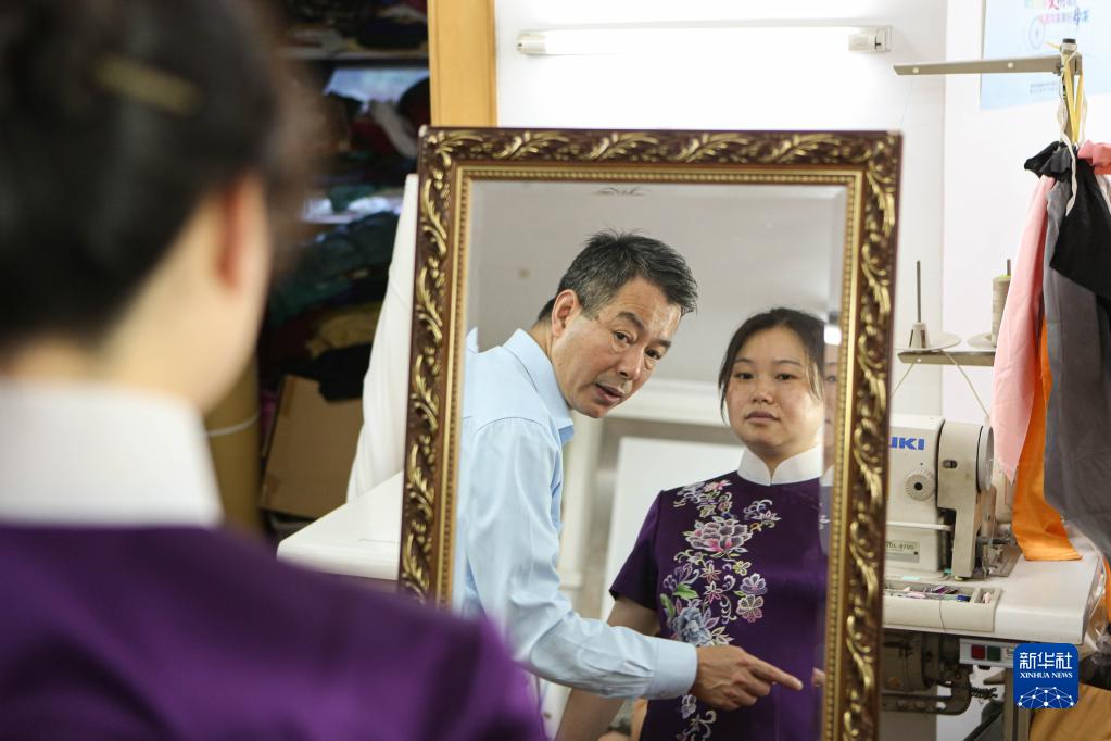 5月31日,江滿(mǎn)宗(左)在上海市“龍鳳旗袍制作技藝——國家級非物質(zhì)文化遺產(chǎn)傳習所”為顧客測量身材尺寸。