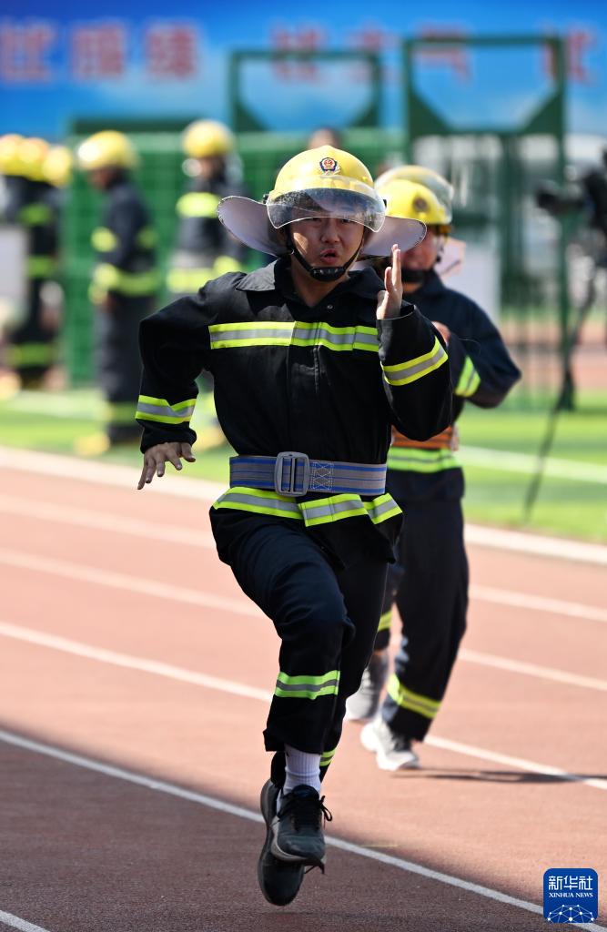 6月2日,大學(xué)生代表參加身穿消防服100米跑趣味消防運動(dòng)比賽。