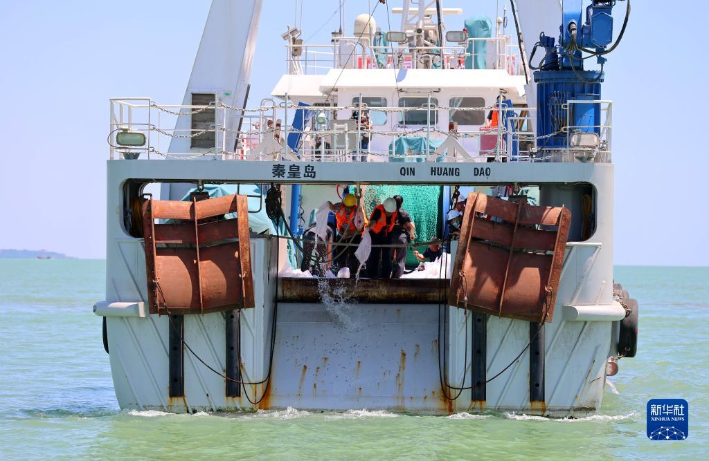 6月2日,參加增殖放流活動(dòng)的人員在秦皇島市北戴河新區海洋漁業(yè)資源增殖放流基地海域投放魚(yú)苗。