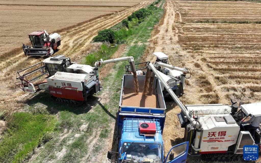 6月2日,在江蘇省淮安市洪澤區三河鎮草橋村麥田里,農民駕駛收割機將小麥裝車(chē)(無(wú)人機照片)。