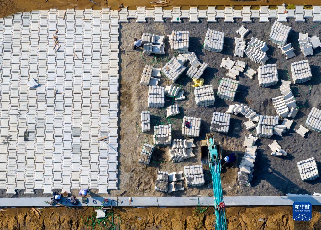 6月2日,工人在淮河入海水道二期工程淮安市先導段鋪設護坡(無(wú)人機照片)。