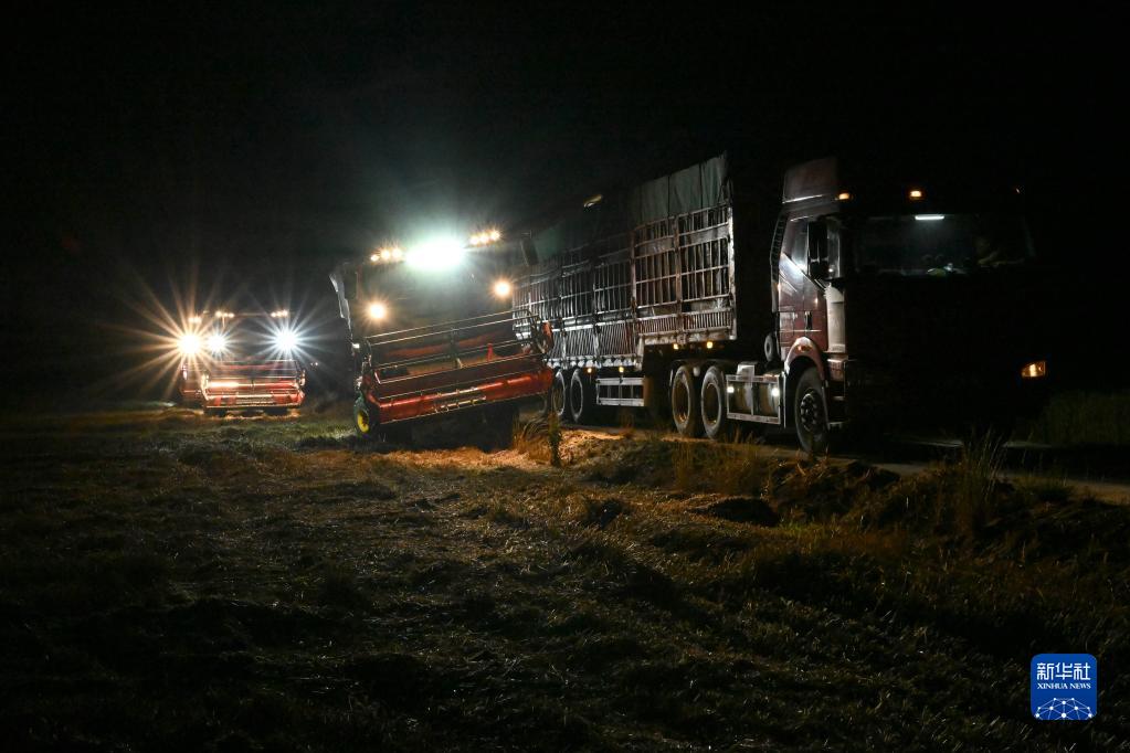 6月2日夜晚,在阜陽(yáng)市阜南縣苗集鎮的一處麥田,農機手駕駛收割機將收獲的小麥裝車(chē)。