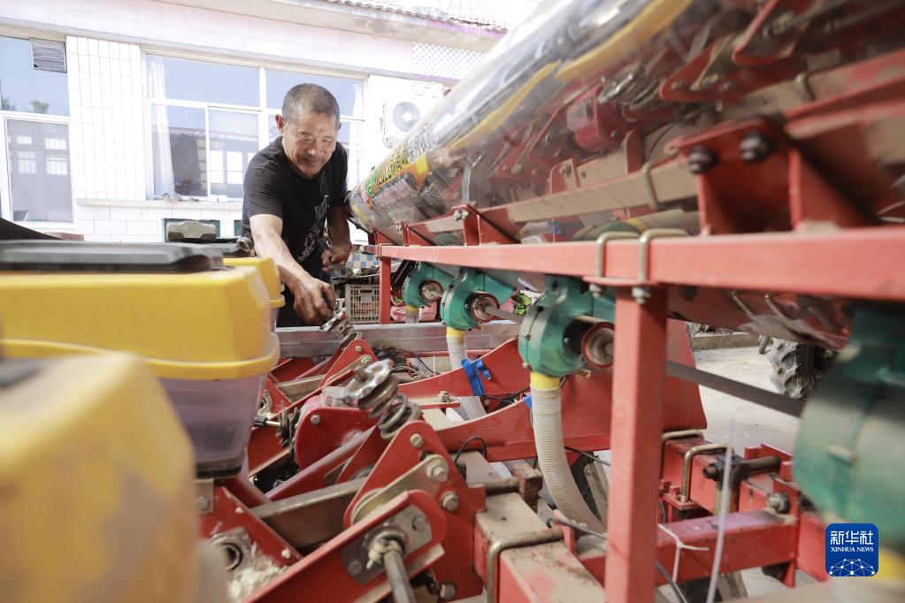 6月2日,在河北省唐山市豐潤區石各莊鎮一家農機專(zhuān)業(yè)合作社,農機手在檢修播種機。