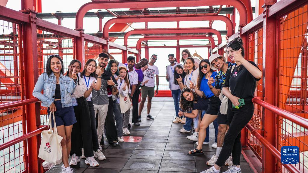 6月3日,留學(xué)生實(shí)地參觀(guān)壩陵河大橋時(shí)留影。