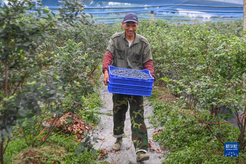 6月3日,在位于長(cháng)興縣虹星橋鎮譚家村的金藍家庭農場(chǎng)的藍莓種植區內,種植戶(hù)搬運剛采摘的藍莓。