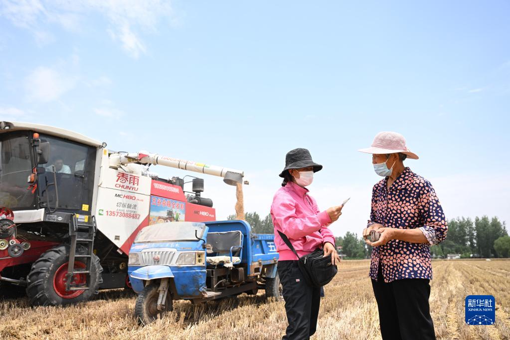 6月2日,在安徽省阜陽(yáng)市阜南縣許堂鄉劉崗村,陳麗娟和村民確認收割費用。