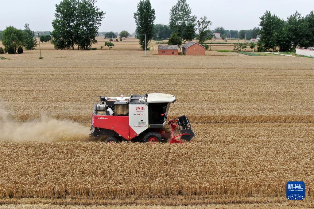 6月2日,在安徽省阜陽(yáng)市阜南縣許堂鄉劉崗村,董斐斐駕駛收割機為村民收割小麥(無(wú)人機照片)。