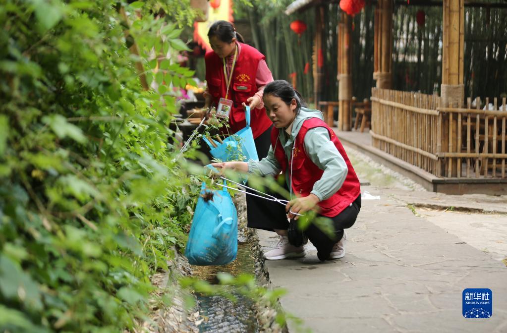6月3日,在山東省臨沂市沂南縣竹泉村景區,參加志愿環(huán)?;顒?dòng)的志愿者在撿拾垃圾。