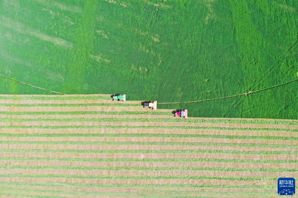 6月4日,在土默特左旗國家現代農業(yè)示范區內,機械車(chē)輛在收割苜蓿(無(wú)人機照片)。