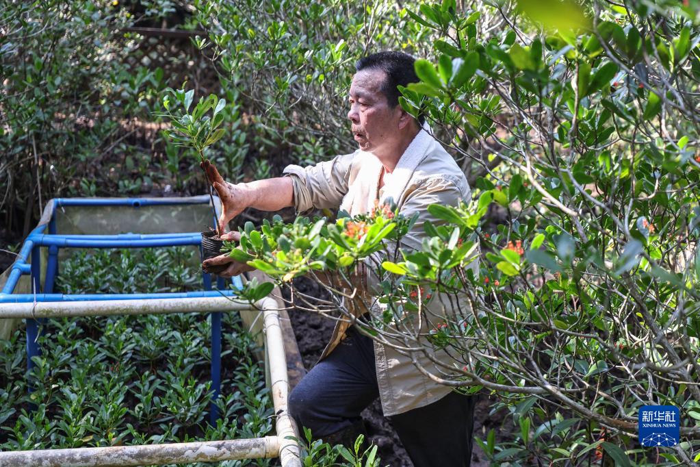 6月2日,王式軍在海南東寨港國家級自然保護區的苗圃?xún)裙茏o紅欖李幼苗。