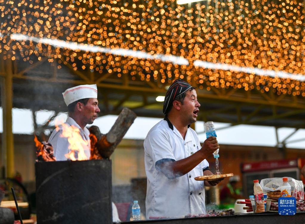 5月22日,燒烤攤主在新疆喀什地區麥蓋提縣N39°沙漠旅游景區的美食廣場(chǎng)上熱情吆喝。2023年環(huán)塔拉力賽期間,該景區專(zhuān)門(mén)設置了多個(gè)美食攤位,滿(mǎn)足參賽人員、游客的消費需求。