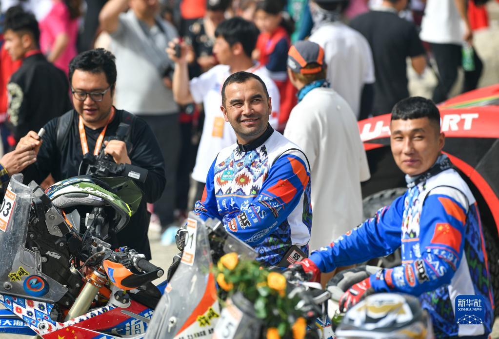 6月1日,在新疆和田地區約特干故城景區,環(huán)塔拉力賽參賽代表扎克爾·牙克甫(中)和隊友一起參加旅游展示活動(dòng)。