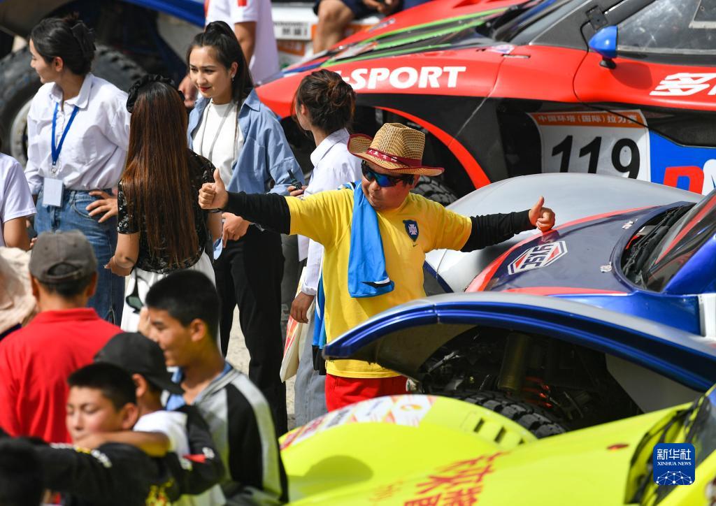 6月1日,在新疆和田地區約特干故城景區,游客參觀(guān)2023年環(huán)塔拉力賽參賽車(chē)輛。