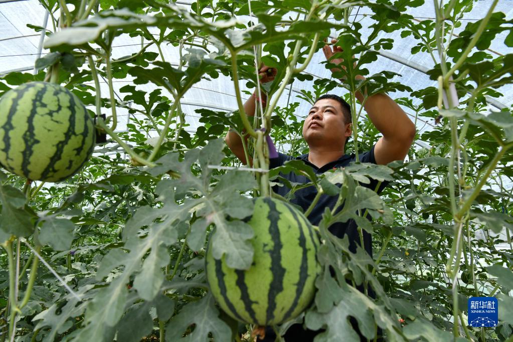 6月4日,農民在獻縣河城街鎮梅莊洼農場(chǎng)大棚內管理種植的西瓜。