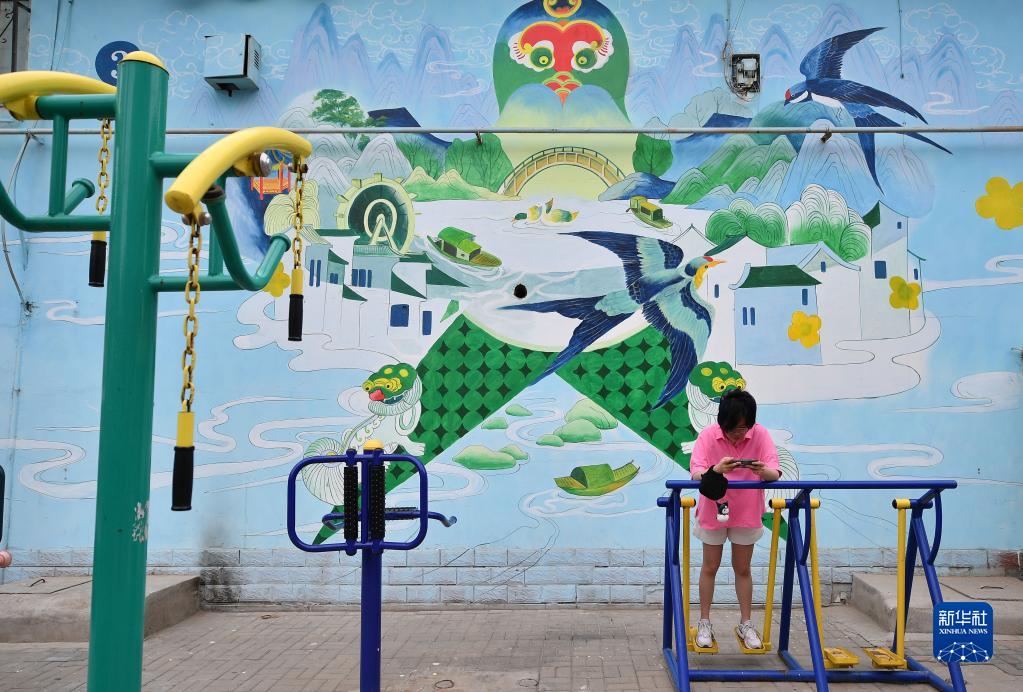 6月4日,市民在銀川市興慶區教育巷墻繪前健身。