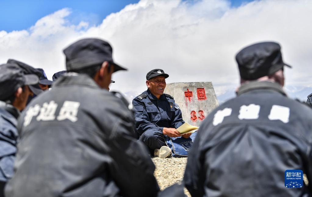 6月2日,在33號界樁處,護邊聯(lián)防隊在隊長(cháng)石角(右二)的帶領(lǐng)下學(xué)習。