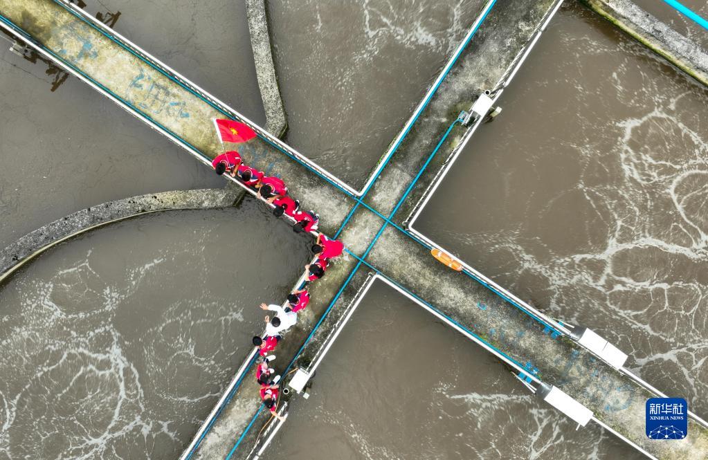6月4日,在貴州省開(kāi)陽(yáng)縣的“探秘污水凈化之旅,迎接世界環(huán)境日”主題教育活動(dòng)中,學(xué)生們在開(kāi)陽(yáng)縣污水處理廠(chǎng)二期參觀(guān)生化池(無(wú)人機照片)。