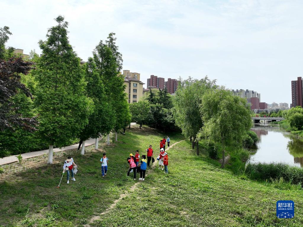 6月4日,在山東青島西海岸新區隱珠公園,青年志愿者和學(xué)生一起撿拾垃圾(無(wú)人機照片)。