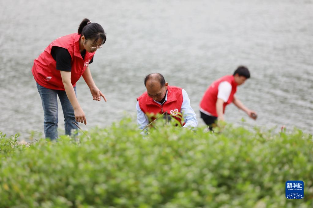 6月4日,志愿者在貴州省黔東南苗族侗族自治州施秉縣甘溪鄉高碑村舞陽(yáng)河畔清理垃圾。