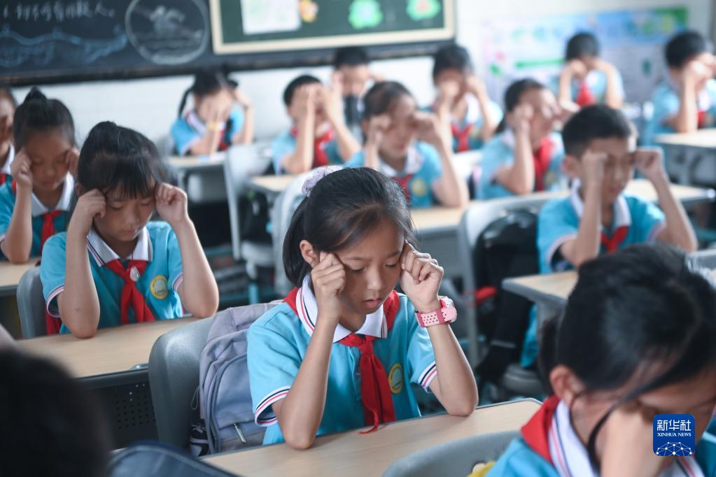 6月5日,東林小學(xué)的學(xué)生們在愛(ài)眼知識課上做眼保健操。