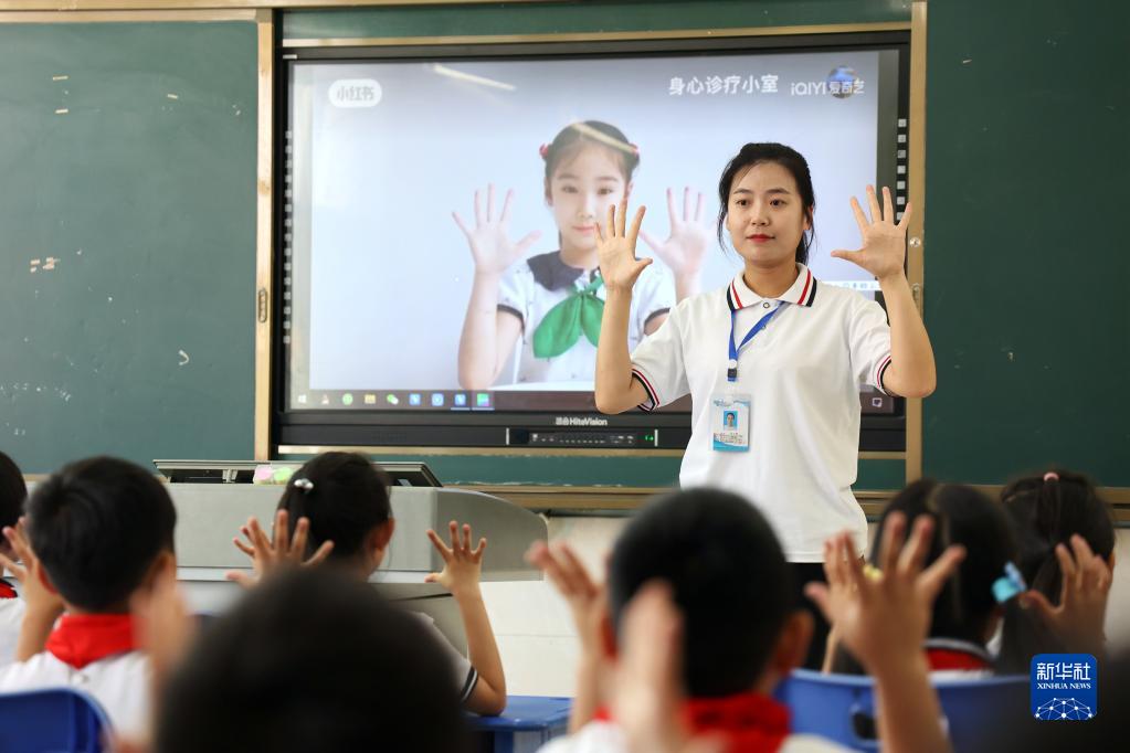 6月5日,在山東省濱州市渤海中學(xué)南校區,老師指導小學(xué)生做無(wú)接觸式眼保健操。