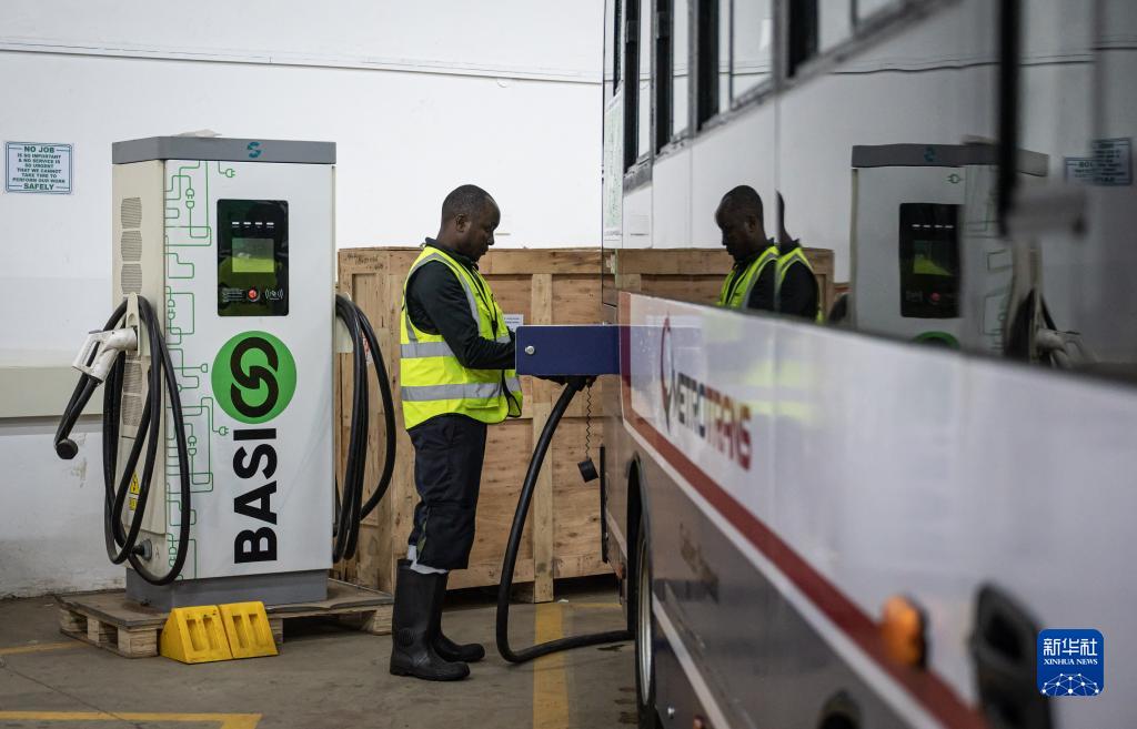 6月2日,在肯尼亞內羅畢,肯尼亞電動(dòng)巴士公司工作人員為電動(dòng)巴士充電。