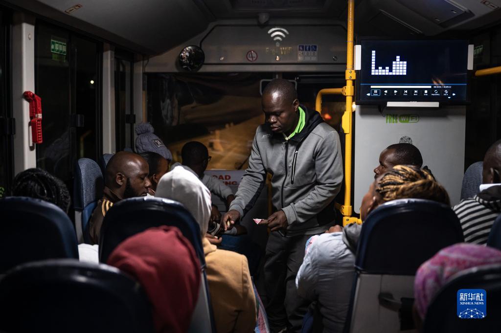 6月3日,在肯尼亞內羅畢,肯尼亞電動(dòng)巴士公司檢票員在車(chē)上收費。