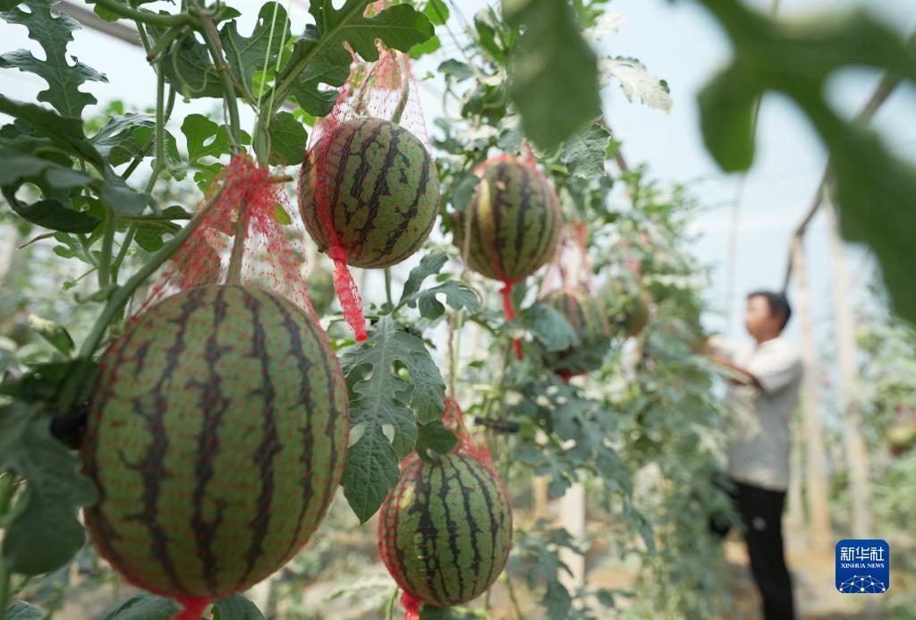 6月5日,盧龍縣木井鎮一家西瓜種植合作社的社員在大棚內管護西瓜。