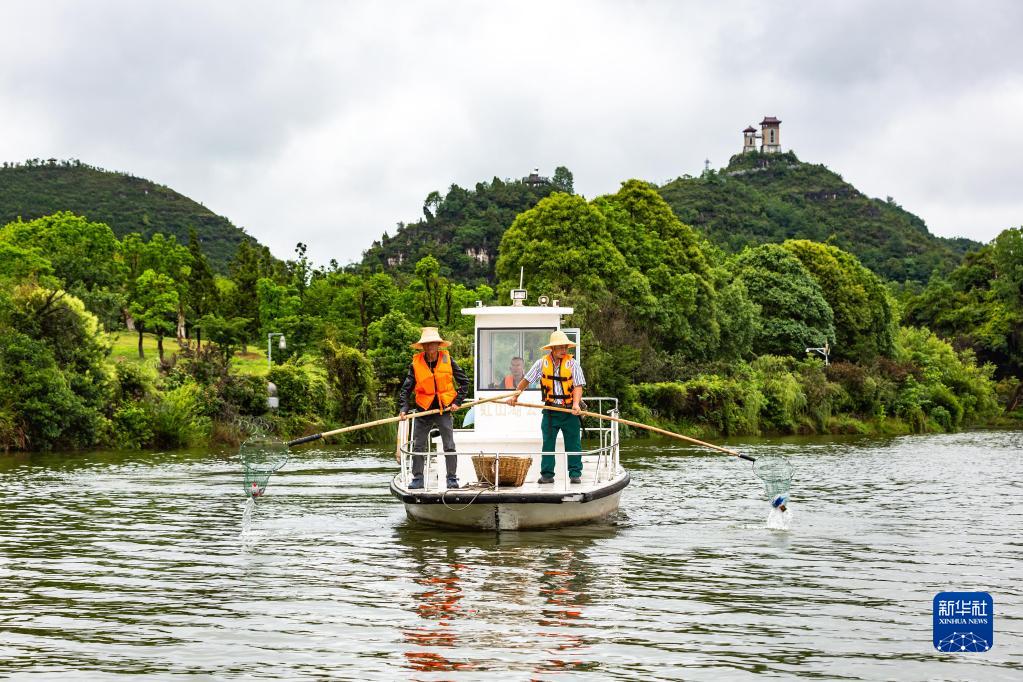 6月5日,環(huán)衛工人在貴州省安順市西秀區虹山湖打撈湖面漂浮物。