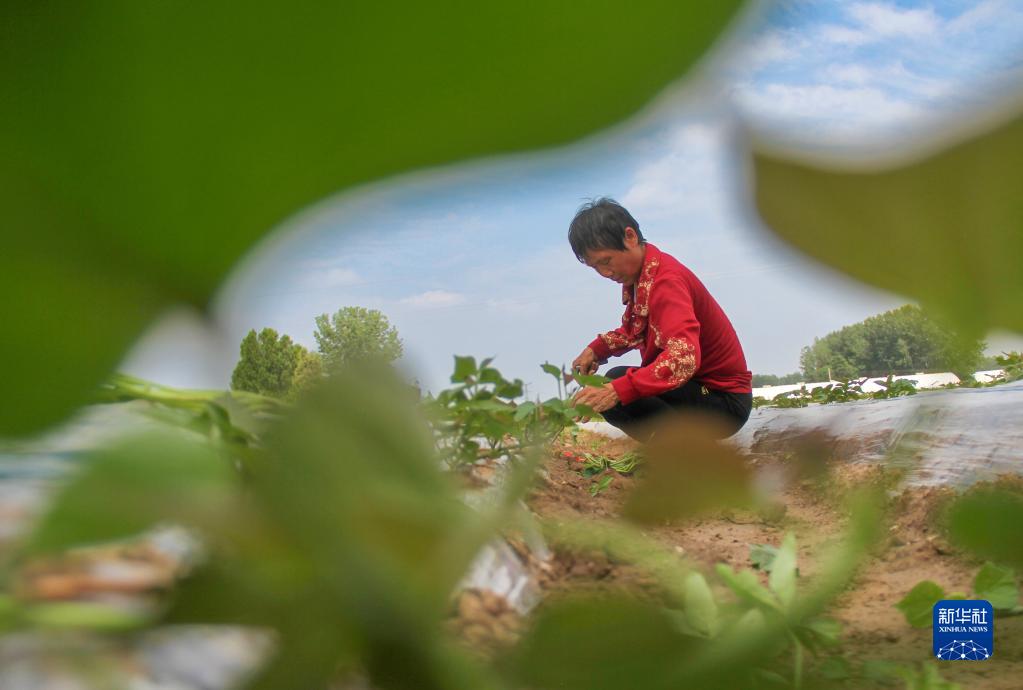 6月5日,村民在河南省商丘市夏邑縣會(huì )亭鎮西街北村田間補栽紅薯苗。