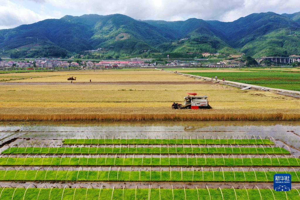 5月24日,在湖北省襄陽(yáng)市??悼h馬橋鎮中坪村,農民駕駛收割機收割小麥(無(wú)人機照片)。