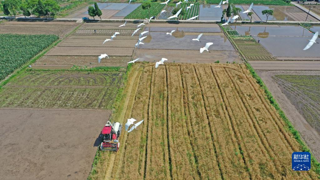 5月25日,在浙江省臨海市永豐鎮,農民駕駛收割機收割小麥(無(wú)人機照片)。