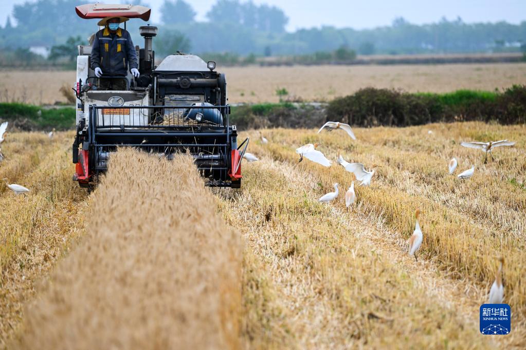 5月21日,農機手在江蘇省昆山市錦溪鎮三聯(lián)村麥田里駕駛聯(lián)合收割機收割小麥。