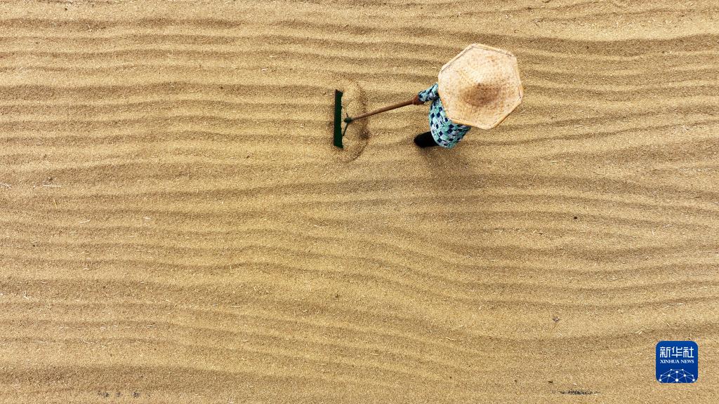 6月5日,山東省臨沂市郯城縣郯城街道農民晾曬小麥(無(wú)人機照片)。
