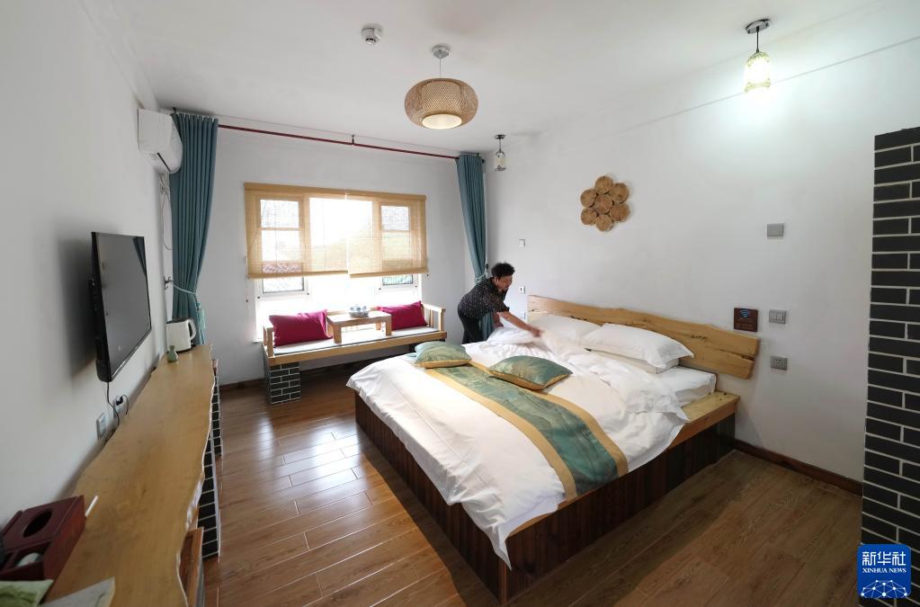 6月5日,秦皇島市北戴河區費石莊村一家精品民宿的工作人員在整理客房的床鋪。
