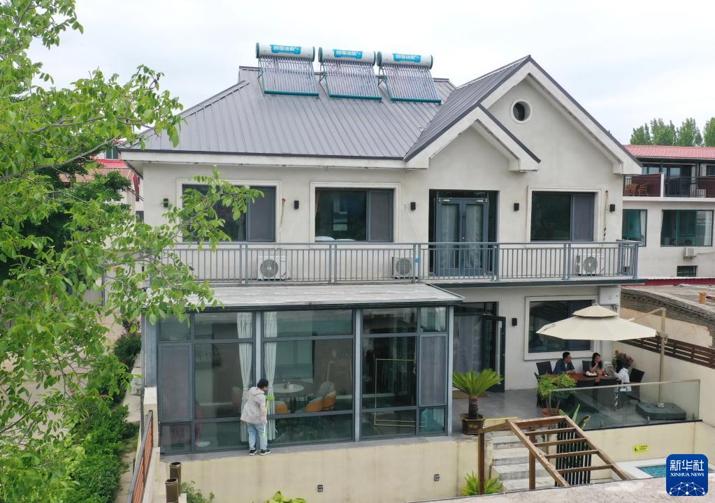 6月5日,秦皇島市北戴河區費石莊村一家精品民宿的工作人員(左)在擦洗客房玻璃(無(wú)人機照片)。