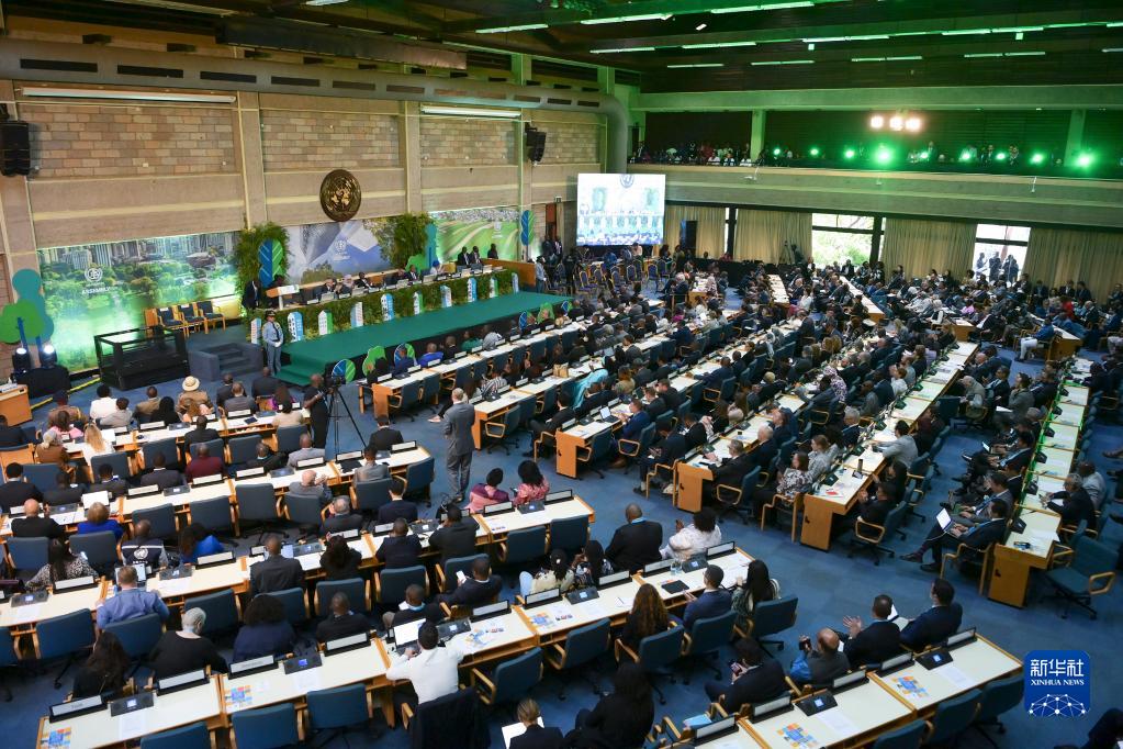 這是6月5日在肯尼亞首都內羅畢拍攝的第二屆聯(lián)合國人居大會(huì )開(kāi)幕式會(huì )場(chǎng)。