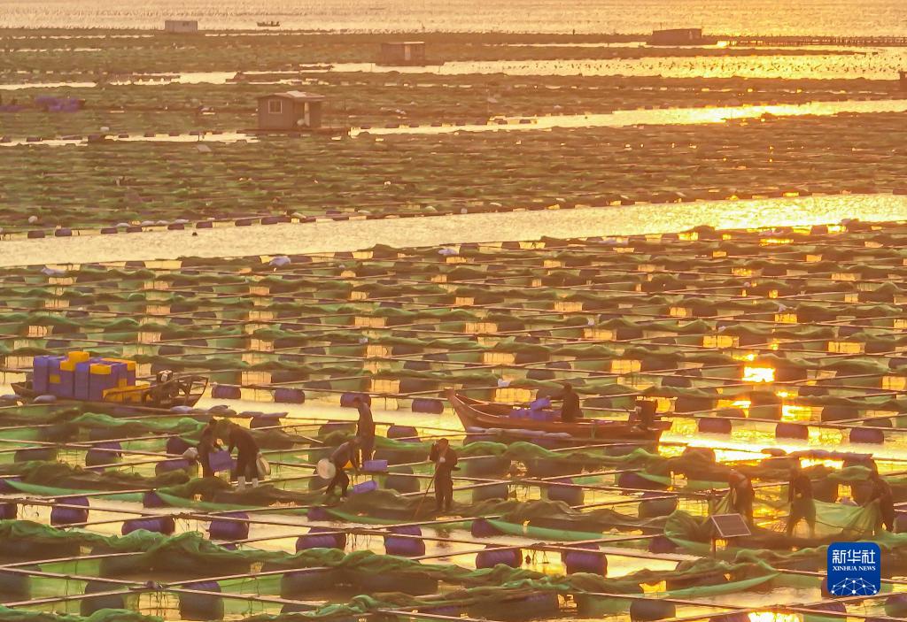 6月5日,在榮成市石島管理區桑溝灣海洋牧場(chǎng)生態(tài)網(wǎng)箱養殖區,漁民在進(jìn)行海上養殖作業(yè)(無(wú)人機照片)。