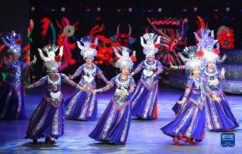 6月5日,演員在貴陽(yáng)大劇院的《多彩貴州風(fēng)》演出中表演節目《金繡銀飾》。