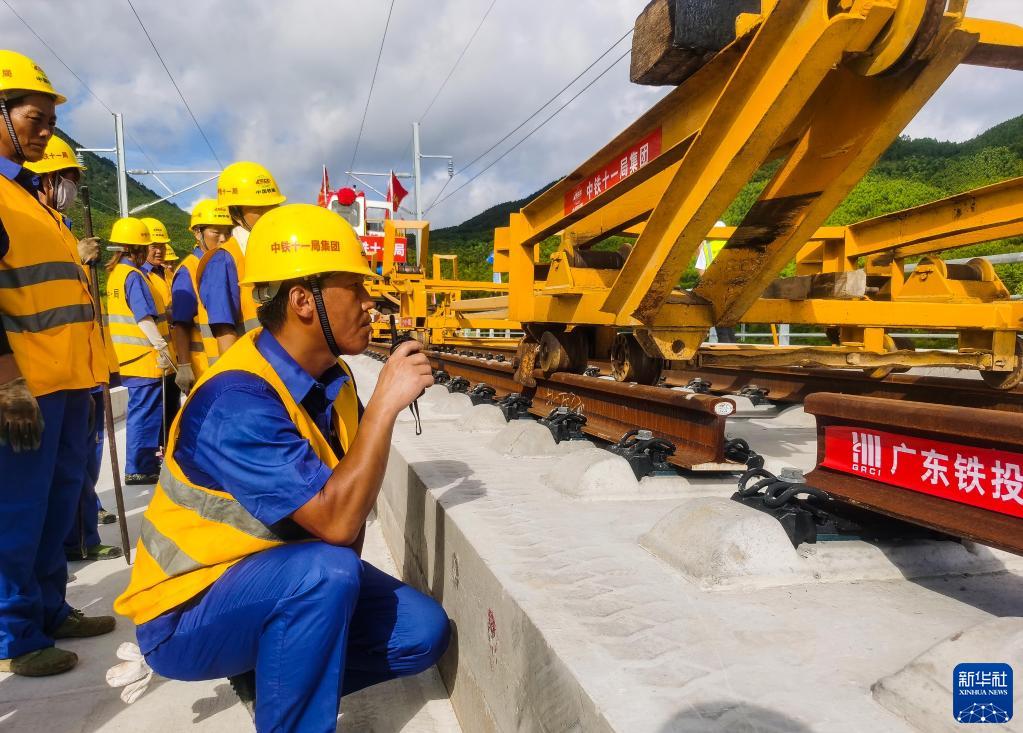 6月6日,中鐵十一局鋪軌機組施工人員在汕汕鐵路汕尾螺河特大橋上進(jìn)行鋪軌作業(yè)。