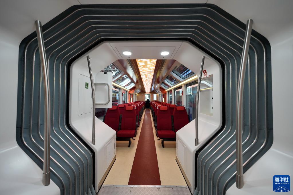 這是在中車(chē)唐山公司拍攝的中國中車(chē)出口阿根廷新能源輕軌車(chē)輛首列車(chē)內景(6月6日攝)。