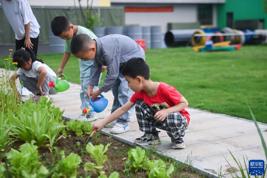 6月6日,孩子們在幼兒園的“農耕園”里除草、澆水。