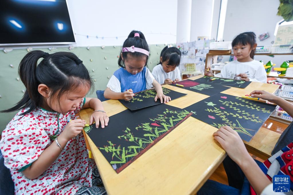 6月6日,孩子們在畫(huà)芒種主題畫(huà)。