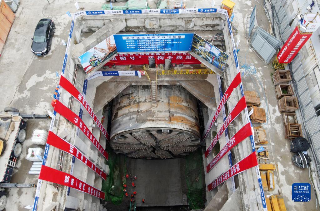 6月6日,空中俯瞰北橫通道新建工程Ⅷ標段安國路井“縱橫號”盾構接收現場(chǎng)(無(wú)人機照片)。