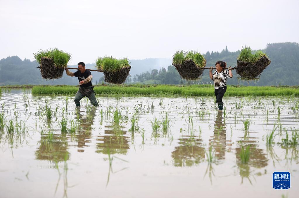 6月6日,貴州省黔東南苗族侗族自治州丹寨縣揚武鎮長(cháng)青社區村民在田間挑運水稻秧苗。