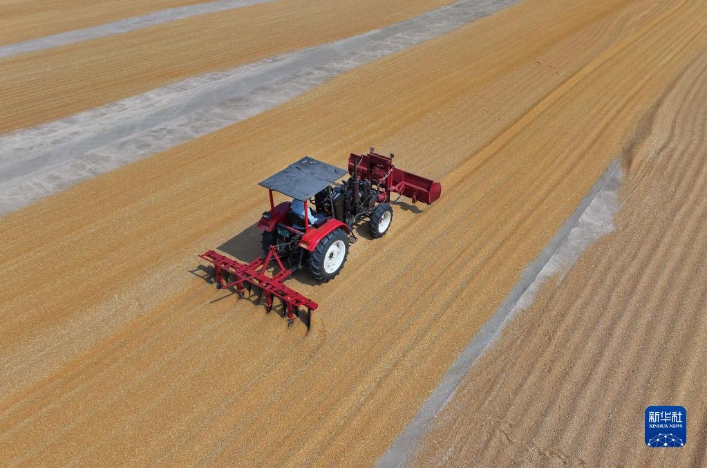 6月6日,在位于江蘇省連云港市海州區的江蘇省云臺農場(chǎng)張圩生產(chǎn)區,工人駕駛農用機械翻曬小麥(無(wú)人機照片)。