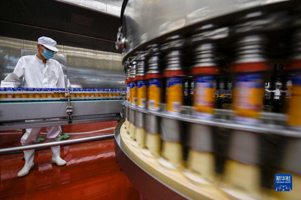 6月6日,在承德縣一家杏仁深加工企業(yè)灌裝車(chē)間,工人在查看灌裝完成的杏仁露。