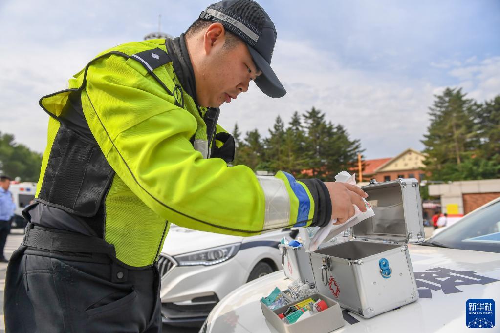 6月7日,在位于吉林省長(cháng)春市的吉林省實(shí)驗中學(xué)考點(diǎn)外,交警準備應急藥箱供考生、家長(cháng)使用。