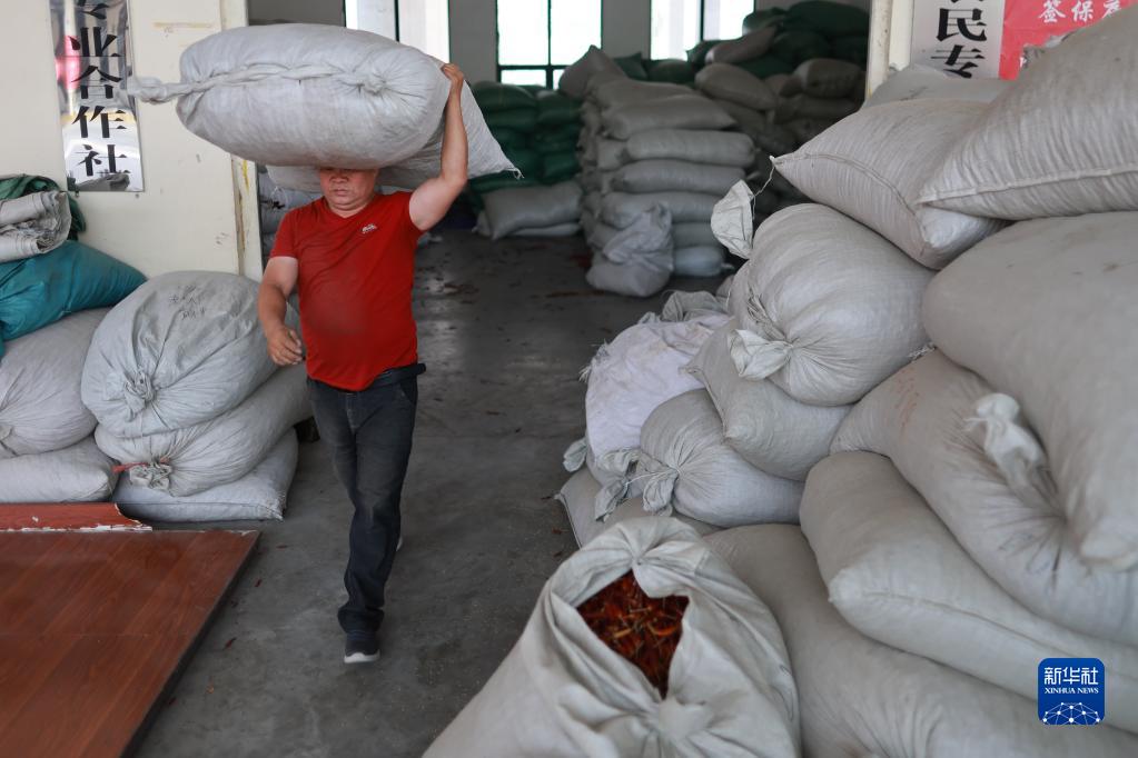 6月6日,工人在貴州省遵義市中國辣椒城搬運辣椒。
