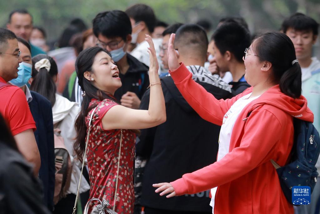 6月7日,在江蘇省揚州中學(xué)考點(diǎn),考生與送考老師擊掌鼓勁。